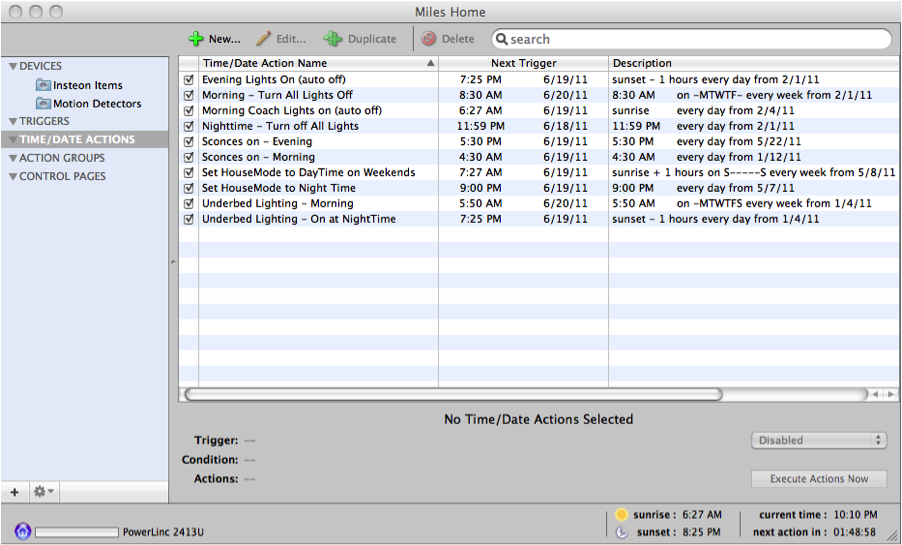 • Setting front porch and outdoor lights to come on based on timed events (e.g., at dusk and dawn w/ shut-down at specified times)